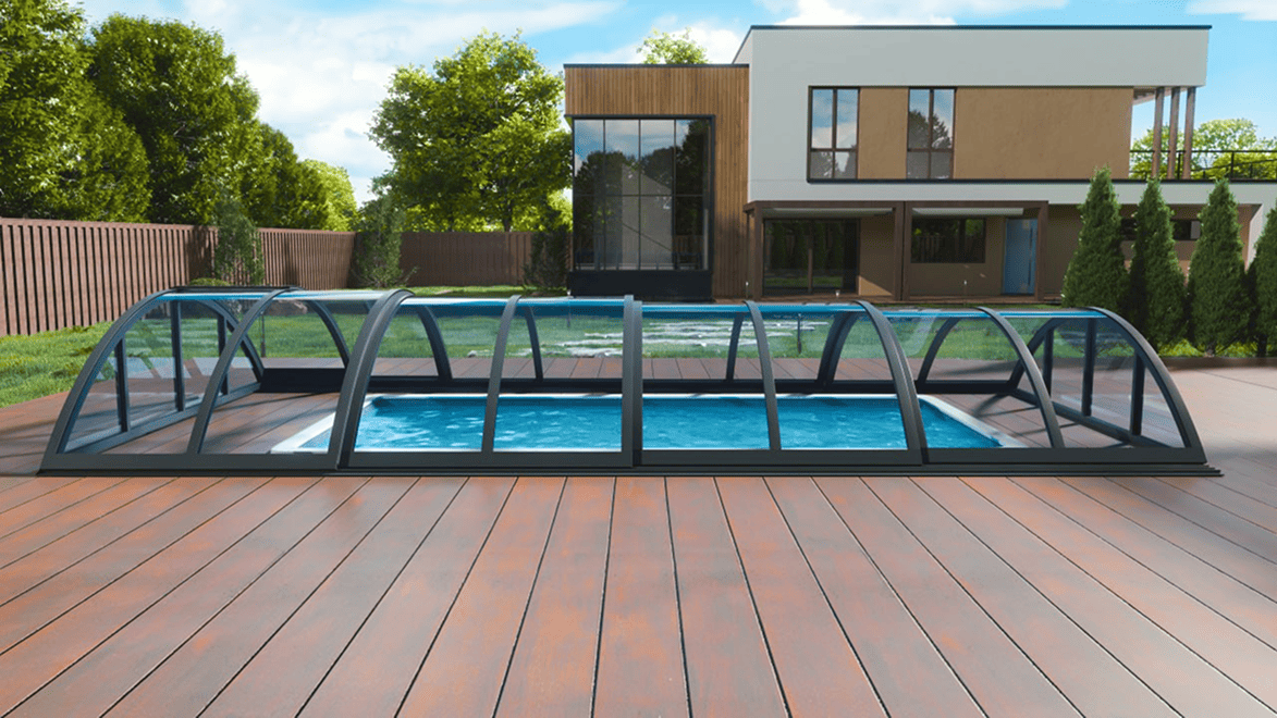 Модель павильона “БАЗА” предлагает современные решения при благоустройстве вашего бассейна. Это низкое ограждение создает отсылку к стилю хай-тек: угловатый прозрачный материал панелей, футуристический дизайн и низкие воздушные направляющие – доказательство его инновационности и современности.